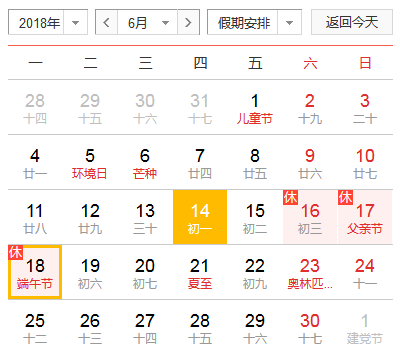 2018年6月16日(周六)—6月18日(周一)放假调休,共3天;