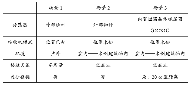 2018年,Satelles公司根据不同的设备、服务和环境设置了3种试验场景,如表1所示。试验结果显示,采用差分数据和精度更高的恒温晶体振荡器(OCXO)后,STL系统的授时精度可达160纳秒。